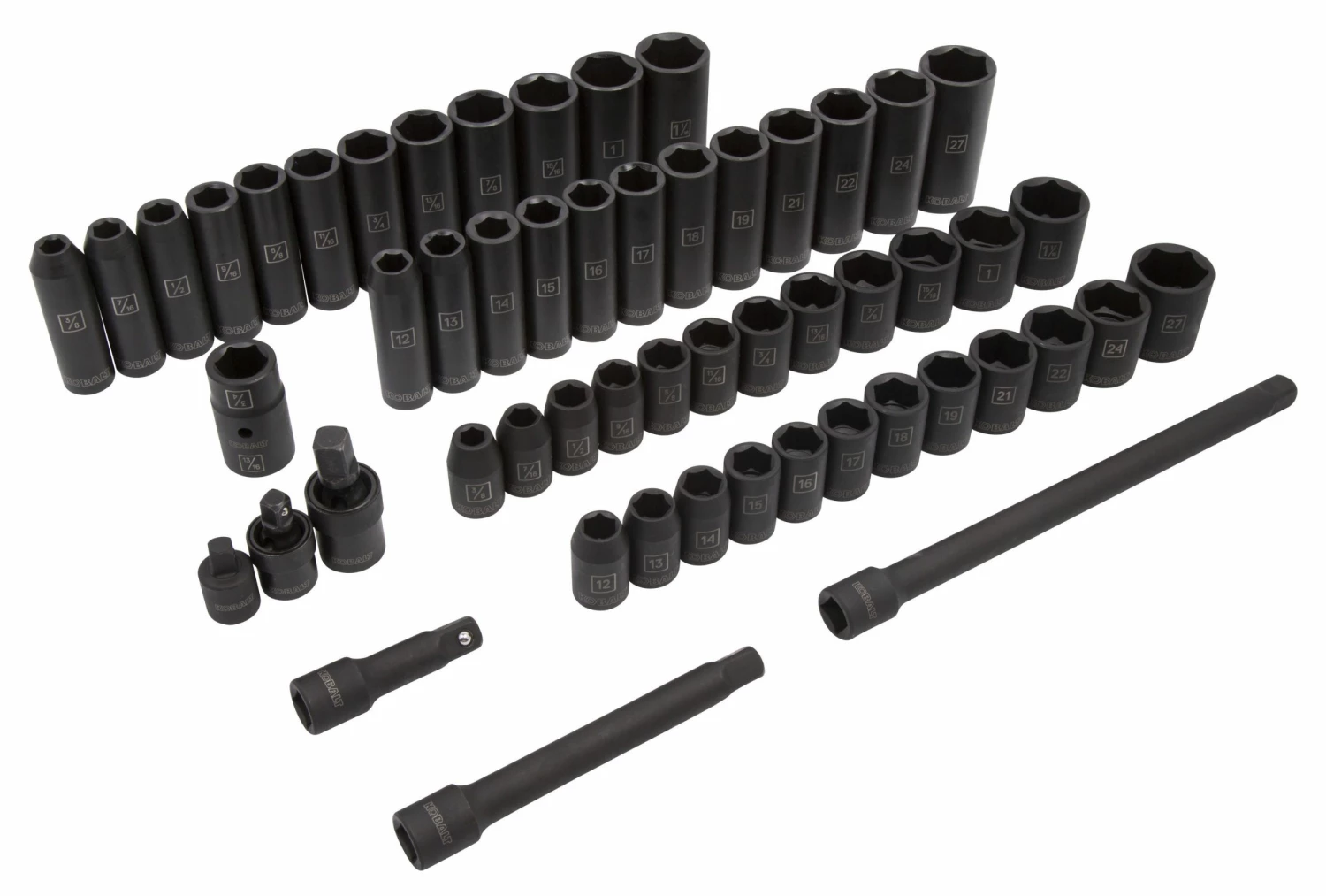 This extensive set of deep and shallow impact sockets and drive tool accessories will help you through any heavy duty job!