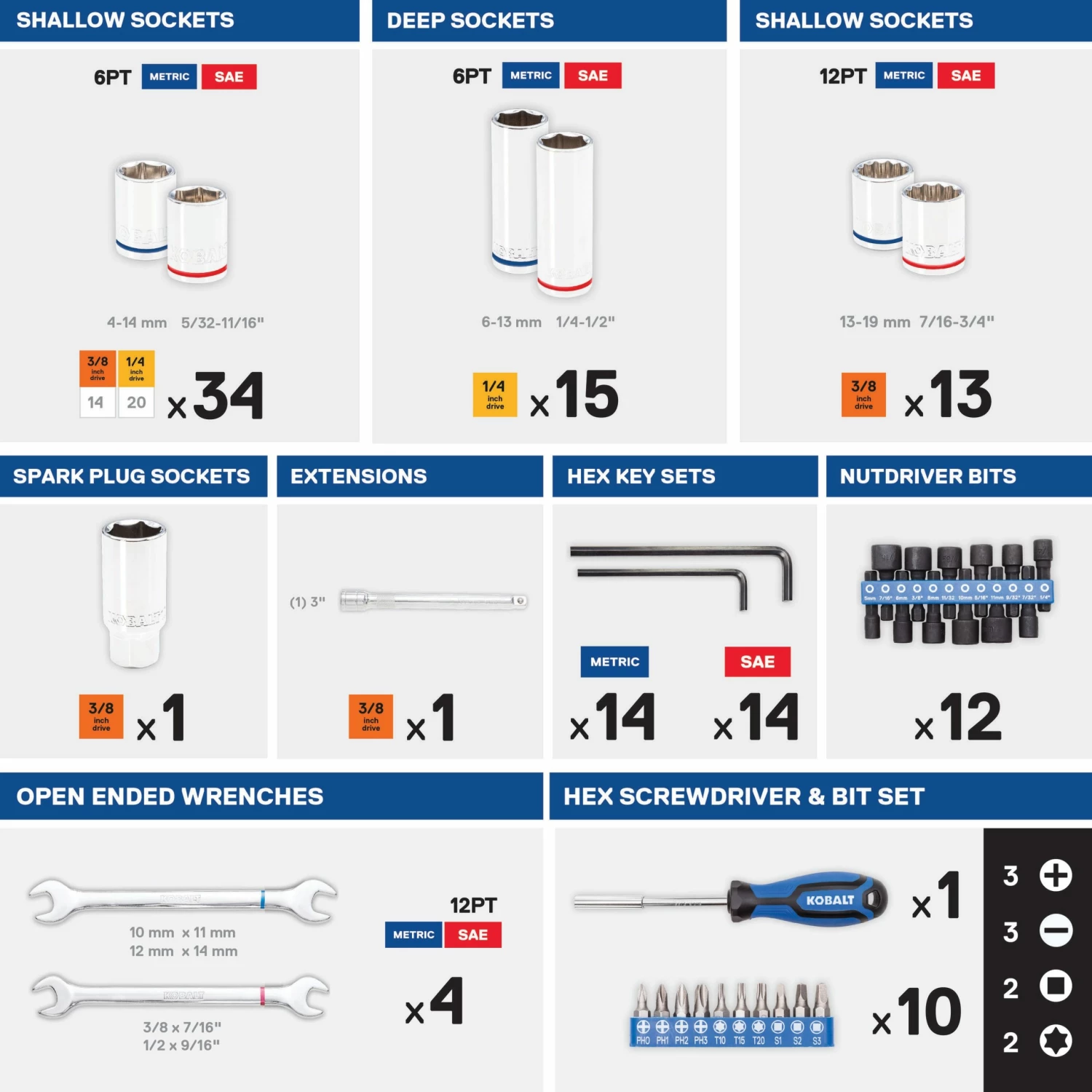 This 129 piece set contains 71 shallow and deep, metric and SAE sockets, 2 ratchets, 1 extension, a magnetic bit driver with 10 insert bits and 12 nut drivers, 4 open-ended wrenches, and 28 hex keys.