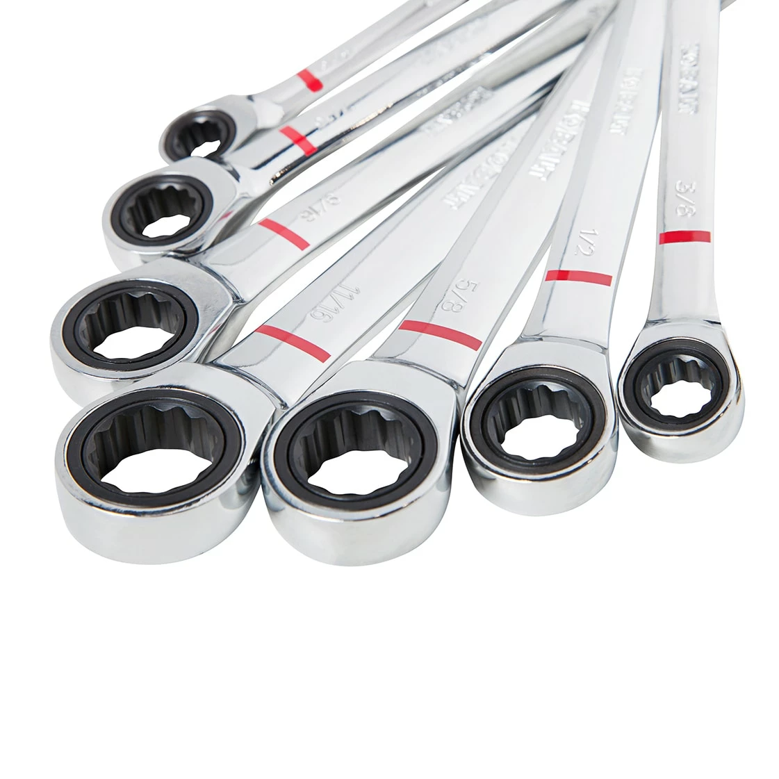 - Set includes 5/16, 3/8, 7/16, 1/2, 9/16, 5/8, 11/16, and 3/4-in flex-box ratcheting wrenches