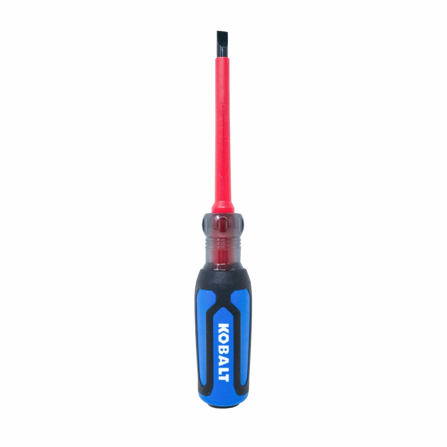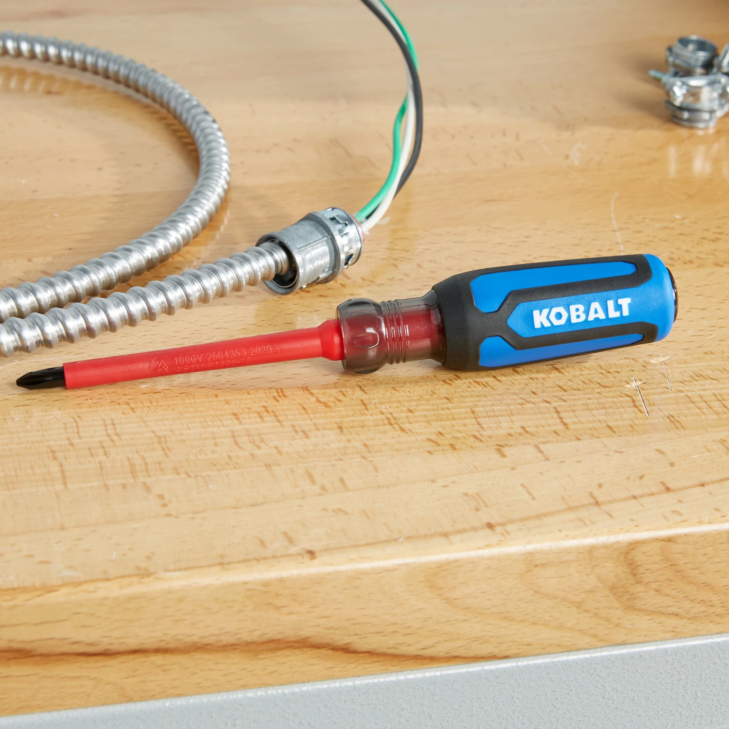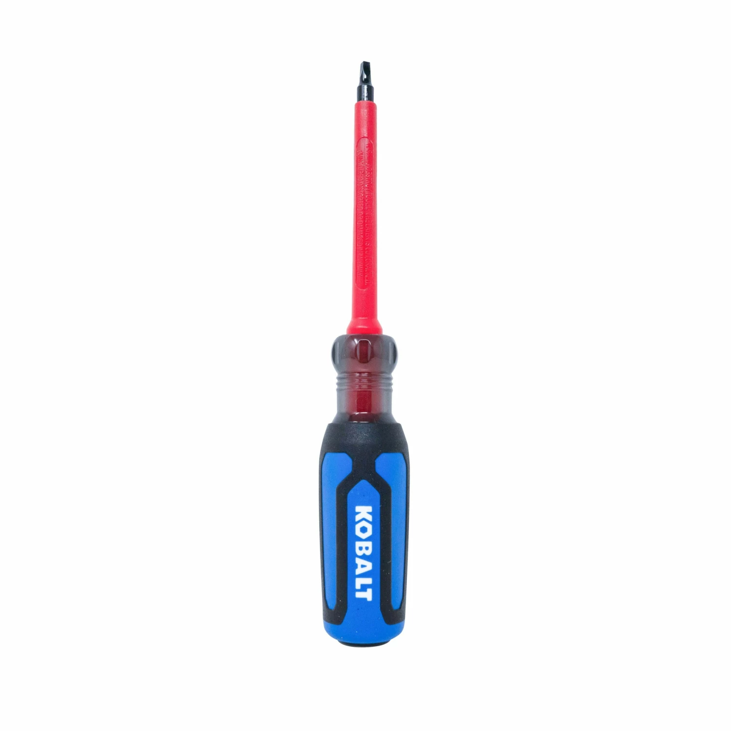 Kobalt’s insulated screwdriver set provides three of the most common bit types and a 1000V insulated design for extra safety on the job. This essential kit provides 1/4″ straight, #2 Phillips, and #2 square drives for a variety of applications. Shafts are insulated S2 steel for high-torque applications and the shaft is anchored in acetate for long life. Comfort-grip handles provide a firm grip and high torque capacity. A great all-around insulated tool kit for any electrician.