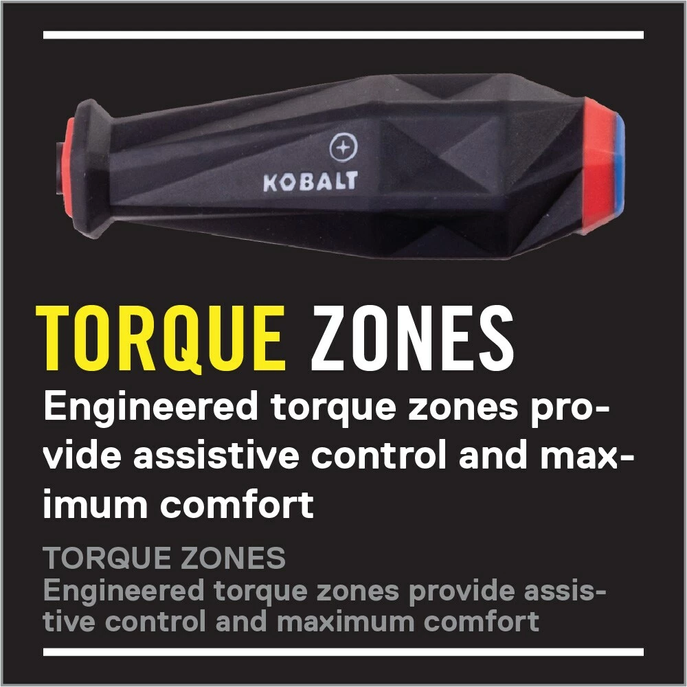 When dealing with fasteners, not every task is the same. Some require more torque, some need you to hold a screwdriver upside down, and some are recessed so deep you can barely reach them, leaving you only able to manipulate the very end of your screwdriver. The Kobalt Performance screwdrivers are engineered and constructed to deal with all of these situations and more. Their advanced ergonomic handles have multiple zones of angled facets and indentations that provide secure surfaces for your fingers to push against without the harsh edges that dig into the palm of your hand when grasping full-handed. No matter how you need to hold the screwdriver to access a fastener, you are assured to have a comfortable grip that allows maximum tool control. When more torque is needed to free a particularly stubborn or rusted fastener, a hex bolster on the shaft base allows a wrench to be used to provide that extra power needed to break them loose. Each screwdriver tip is diamond-coated, providing 3X the gripping power and greatly reduces the risk of cam-out and rounding of your fastener. Bright, color-coded sections on both ends of each handle allow for easy identification of slotted and Phillips tip styles. Additional style icons and molded size call-outs in the handle and laser-etched into the tool shaft also help to quickly identify your screwdrivers. With Kobalt Performance series hand tools, you will experience professional performance blended with personal design and comfort.