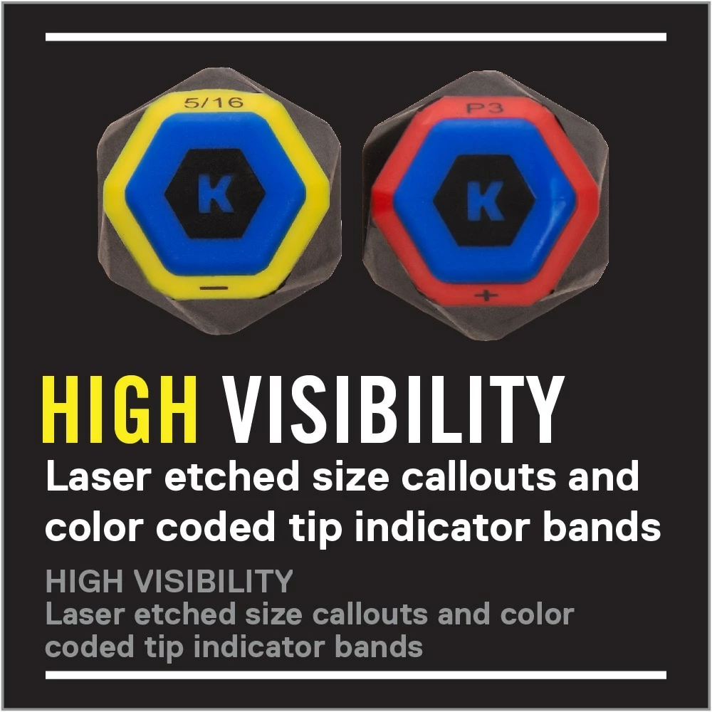 - Each performance screwdriver is marked with high-vis color bands and laser-etched call-outs to help quickly identify each tool