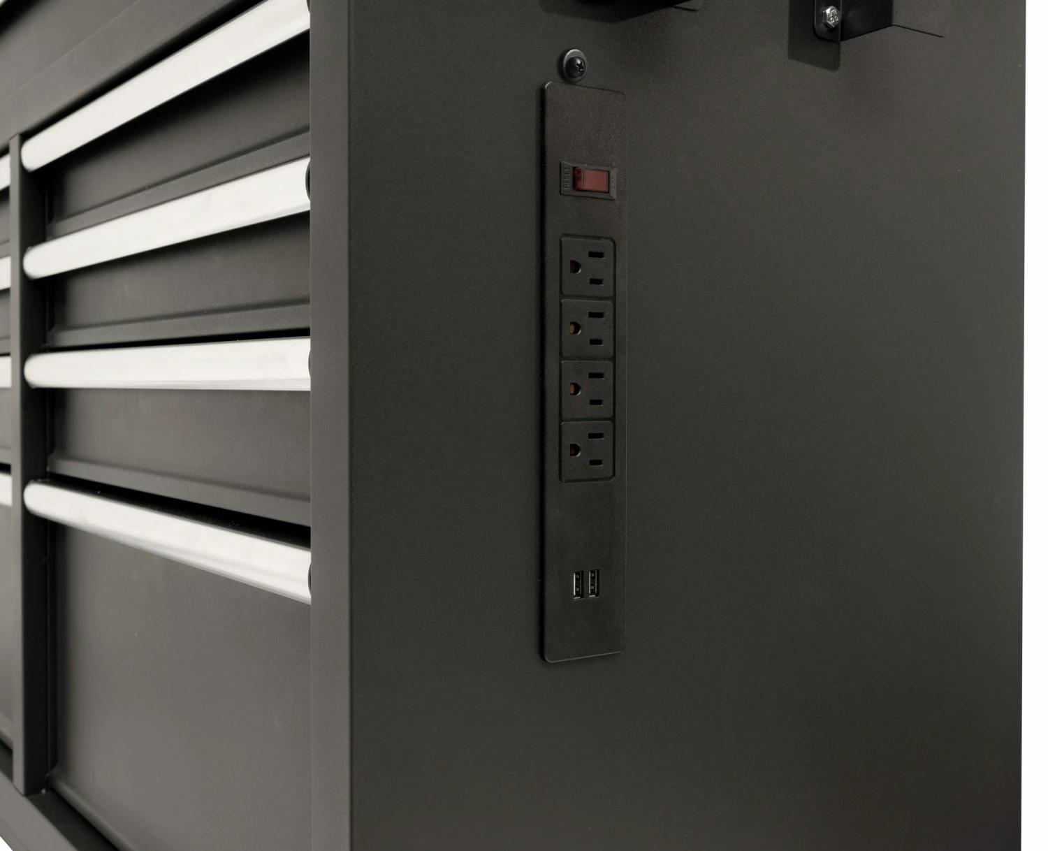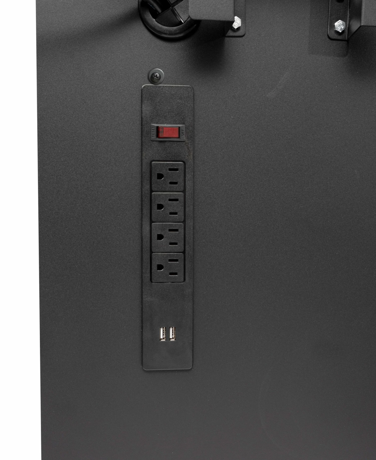 - Integrated power strip with 4-outlets and 2-USB ports for easy charging